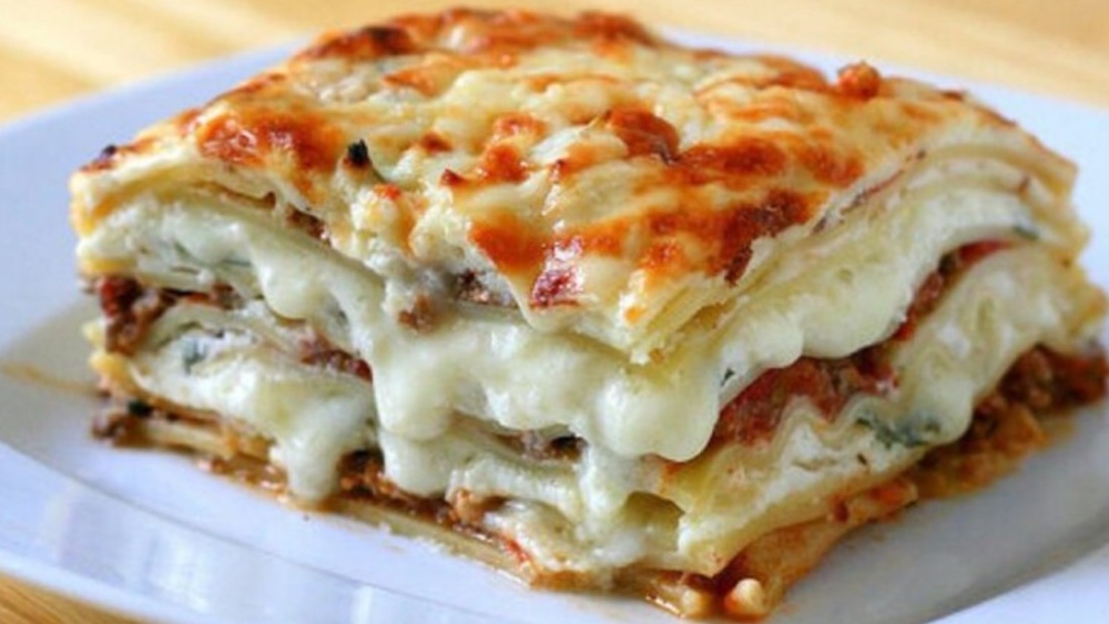 Форму для запекания смазывают оливковым маслом. На дно выливают немного соуса бешамель, укладывают первый слой готовых листов, затем распределяют часть мясной начинки и посыпают тёртым сыром — подойдёт гауда, сулугуни или моцарелла. Слои повторяют ещё два раза. Верх закрывают соусом бешамель и щедро посыпают пармезаном.