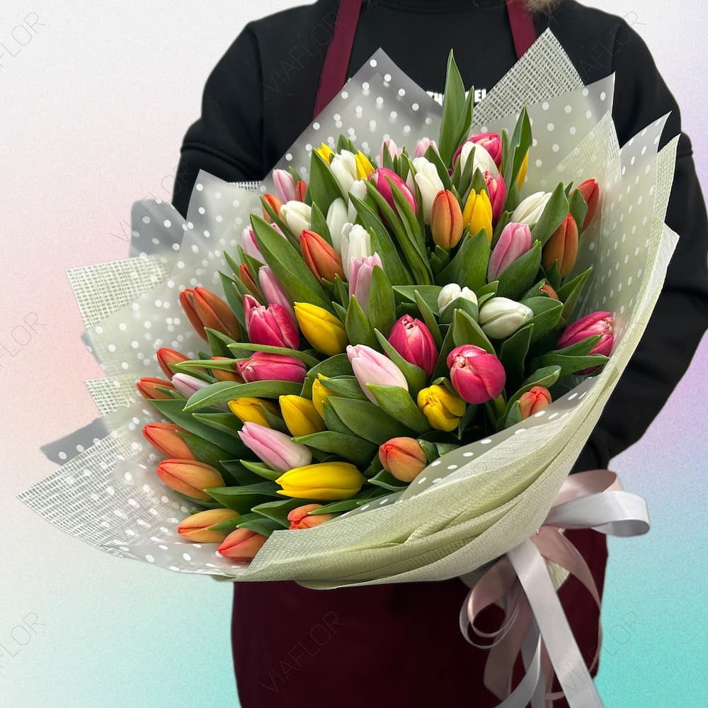 Колірна гамма тюльпанів відіграє ключову роль у створенні настрою букета. Яскраві композиції формуються з червоних та жовтих квіток із додаванням зелені для свіжості. Пастельні букети поєднують кремовий, рожевий та персиковий, створюючи ніжний та повітряний ефект. Динамічні комбінації включають смугасті та махрові сорти, які додають фактурності та неповторного шарму. Букети з двадцяти-тридцяти тюльпанів виглядають пишно, а менші – 7-10 квіток – підкреслюють витончену елегантність.