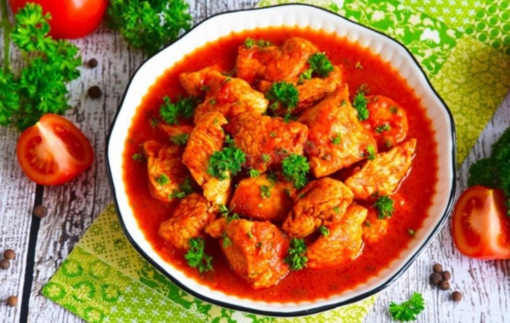 У тій самій сковороді обсмажують цибулю до золотистого кольору, додають томати з пастою, тушкують ще п’ять хвилин. Доливають воду, доводять соус до кипіння, повертають у нього м’ясо й тушкують усе разом під кришкою 10–15 хвилин на малому вогні. Страва виходить соковитою, з виразним овочевим смаком. Готову страву рекомендують посипати свіжою зеленню для кращого аромату та контрасту кольору.