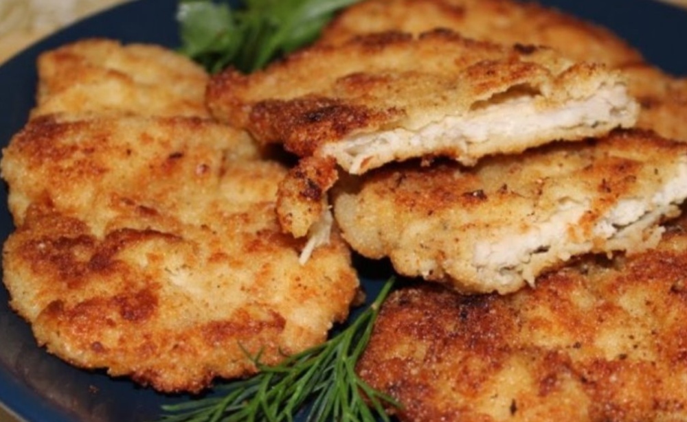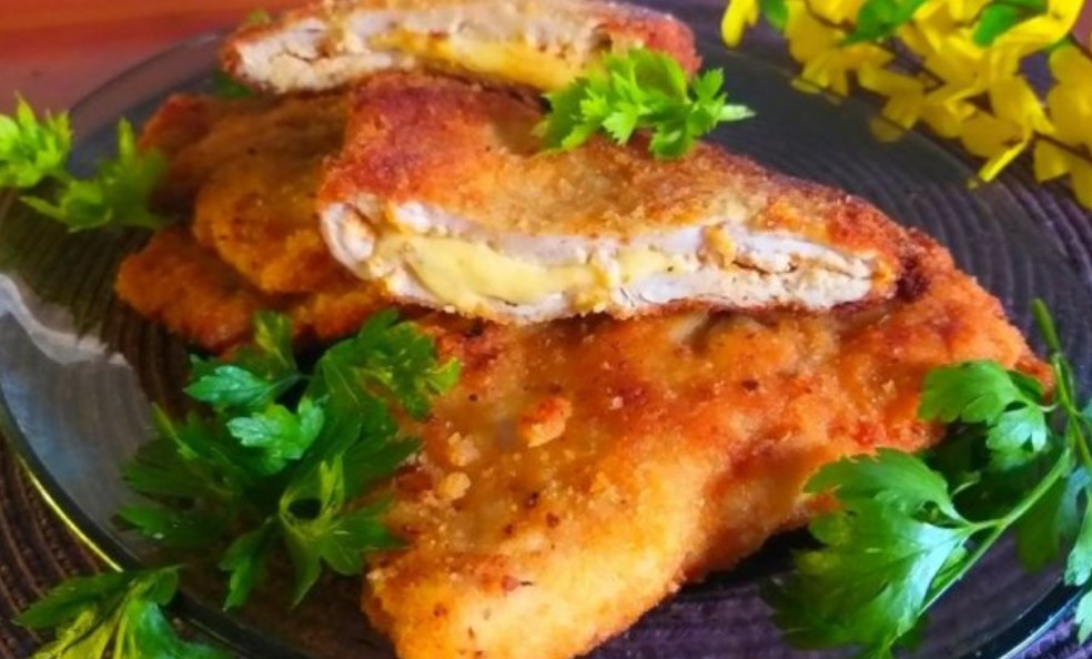 Філе ріжуть на широкі тонкі скибки й злегка відбивають. Посипають спеціями, на кожен шматок кладуть кілька пластинок сиру, після чого складають відбивну навпіл. Заготовки занурюють у збиті яйця й обкачують у сухарях з усіх боків. Смажать на середньому вогні по 4–5 хвилин з кожного боку до рум’яної скоринки. Страва має насичений смак і добре смакує як самостійно, так і з овочевим гарніром.